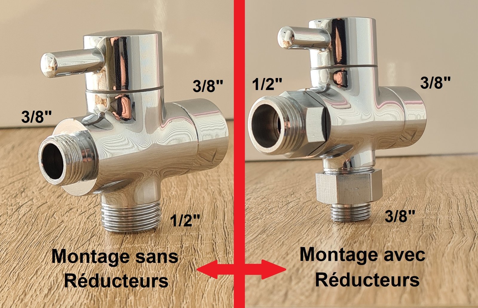 ✅ MONTAGE PAR RÉDUCTEURS : Votre arrivée d’eau est a provenance horizontale ou verticale par tuyau rigide: Vous devrez modifier les dimensions de la vanne 3 voies à l’aide des 2 réducteurs
