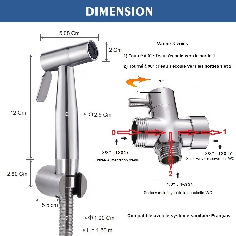 - ✅ VANNE 3 VOIES AUX STANDARDS FRANÇAIS : Les dimensions de la vanne 3 voies sont aux Standards Français de 3/8″ et compatibles avec les installations sanitaires Françaises : Arrivée d’eau 3/8″ – Sortie Réservoir WC 3/8″ – Sortie flexible douchette WC 1/2″